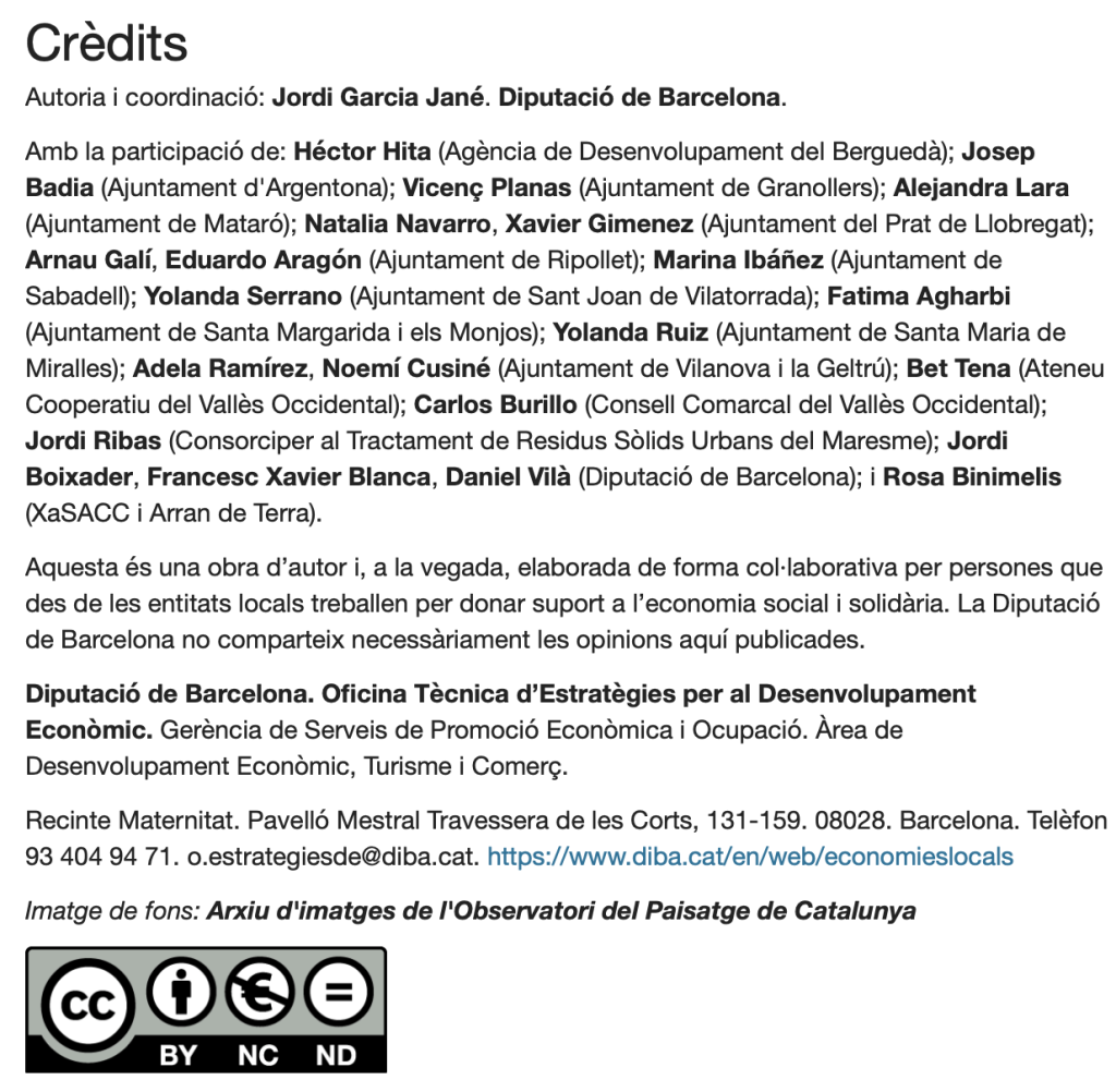 La Diputació de Barcelona, mitjançant l’Oficina Tècnica d’Estratègies per al Desenvolupament Econòmic, Gerència de Serveis de Promoció Econòmica i Ocupació. Àrea de Desenvolupament Econòmic, Turisme i Comerç; ens presenta aquesta publicació per facilitar el suport dels ajuntaments a les iniciatives d’economia social i solidària locals.