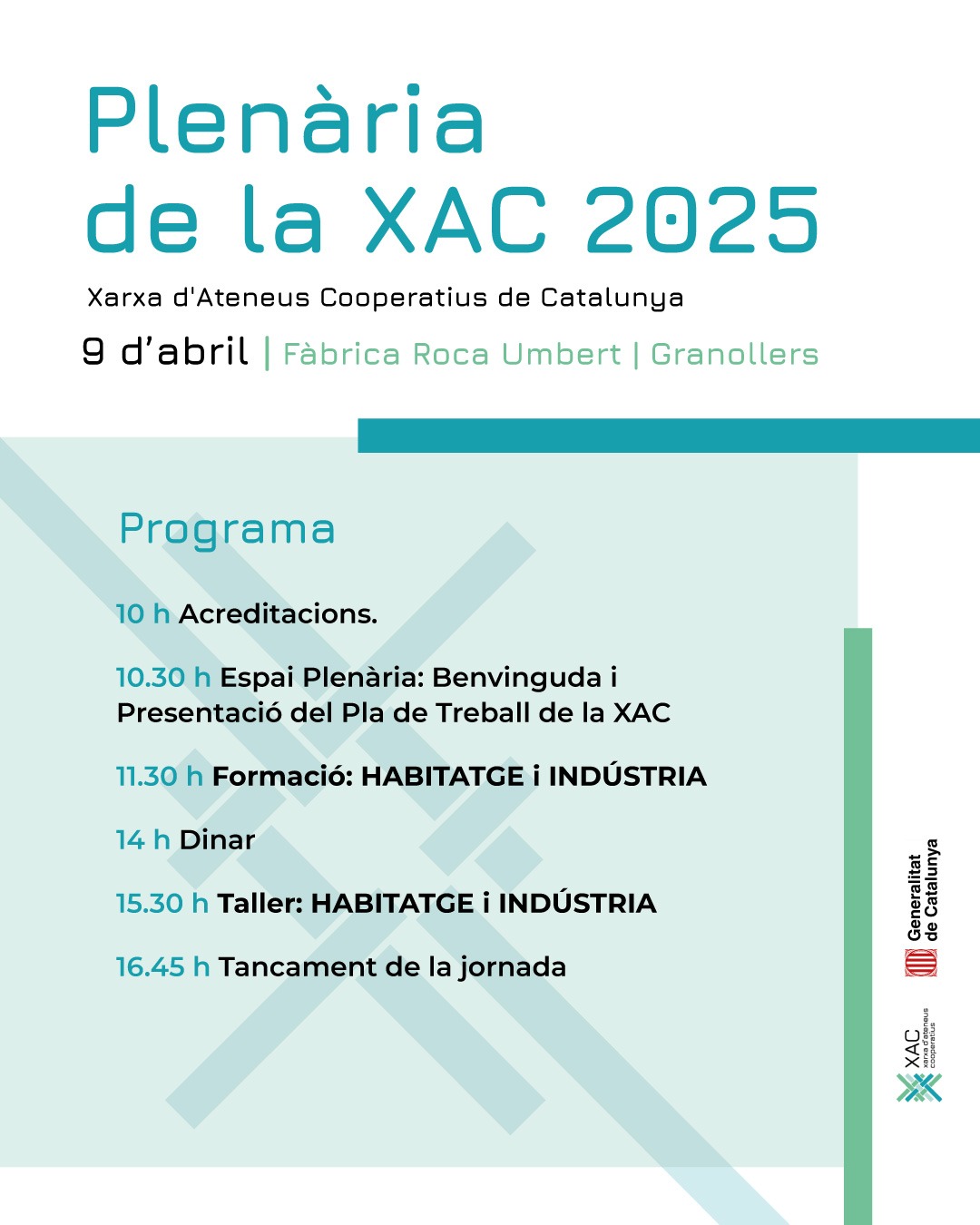 El 9 d’abril a la Fàbrica Roca Umbert de Granollers la Plenària 2025 de la Xarxa d’Ateneus Cooperatius (XAC) de Catalunya. Tal com marca d’ordre de l’actual convocatòria, participaran en la Plenària totes les entitats promotores dels 14 Ateneus Cooperatius de Catalunya.